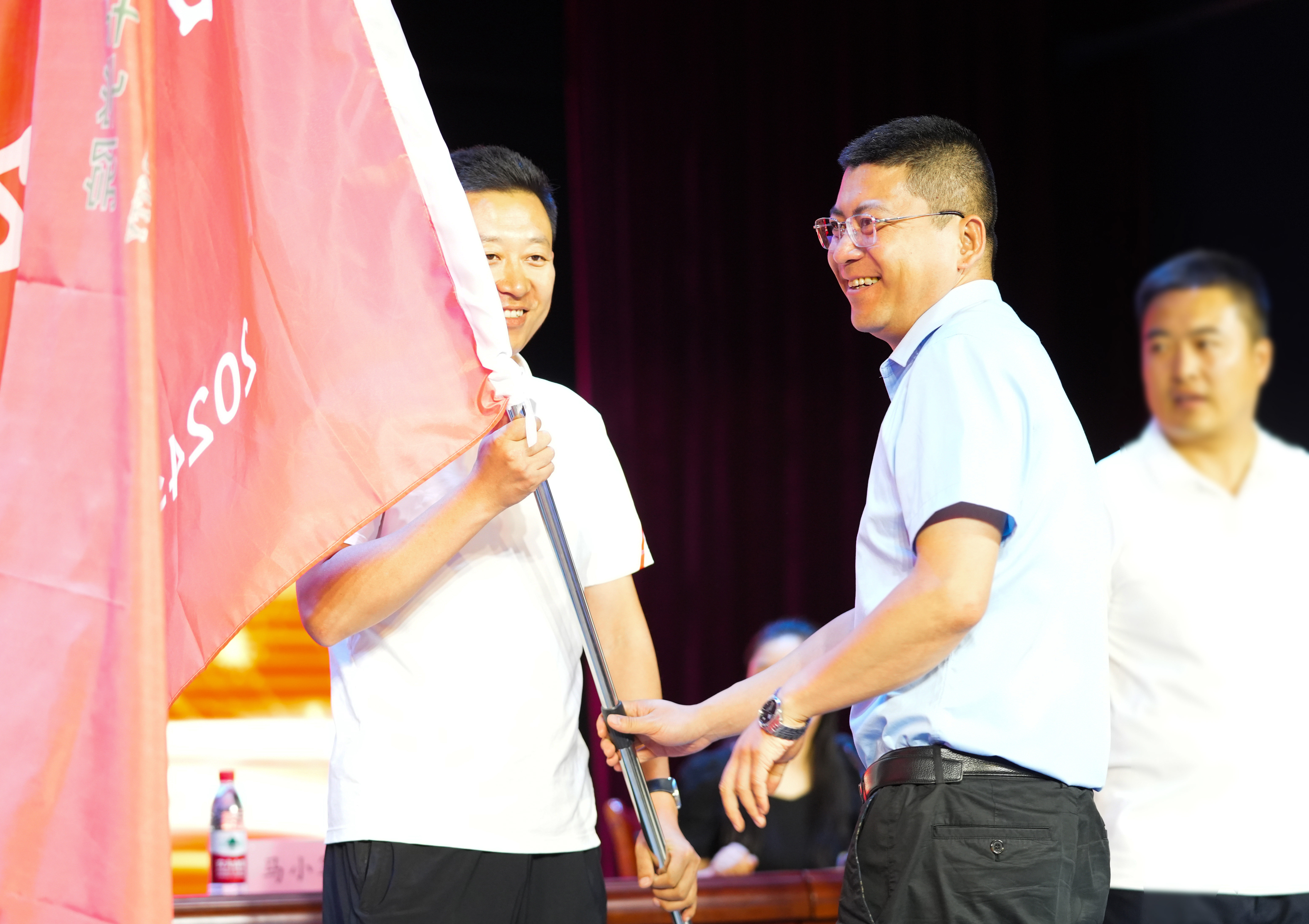 马小军为各系社会实践团队授旗。旗帜飘扬,青春奋进,学院2024年暑期“三下乡”社会实践正式启动。